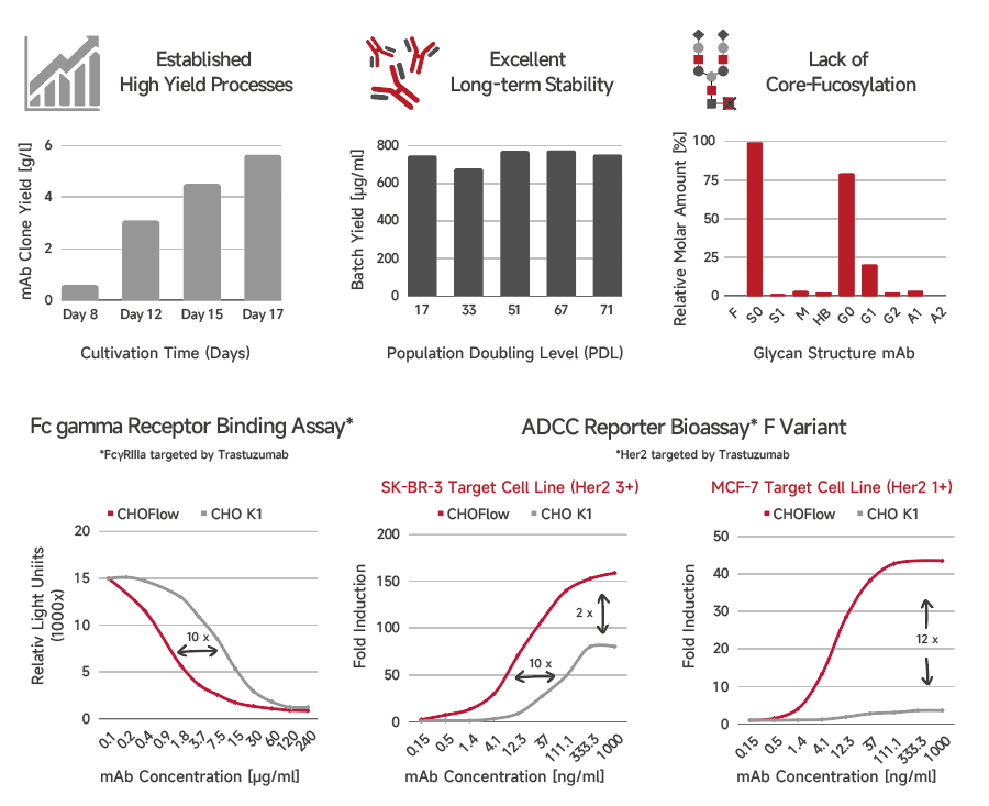 CHOFlow unifies the proven FUT8 genetic knock-out glycosylation strategy with excellent productivities (> 5 g/L) and a robust and stable production process of our CHONAMITE® host cell line.